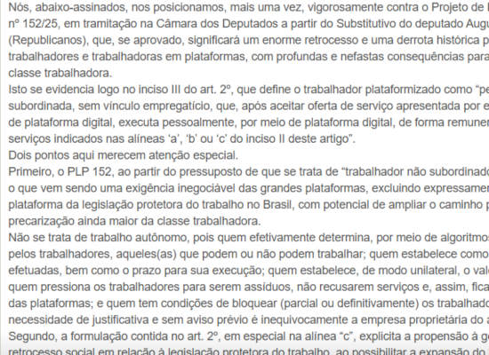 Imagem: Divulgação Está sendo divulgado um manifesto contra o PLP 152/2025, atualmente em tramitação na Câmara dos Deputados. O projeto visa regulamentar o trabalho por aplicativos, transporte e entregas no […]
