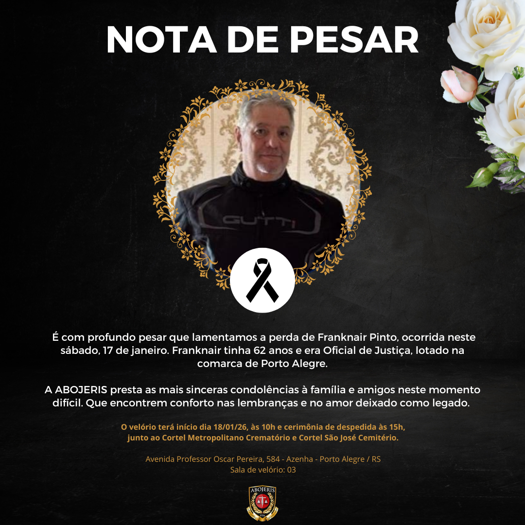 É com profundo pesar que lamentamos a perda de Franknair Pinto, ocorrida neste sábado, 17 de janeiro. Franknair tinha 62 anos e era Oficial de Justiça, lotado na comarca de Porto Alegre.